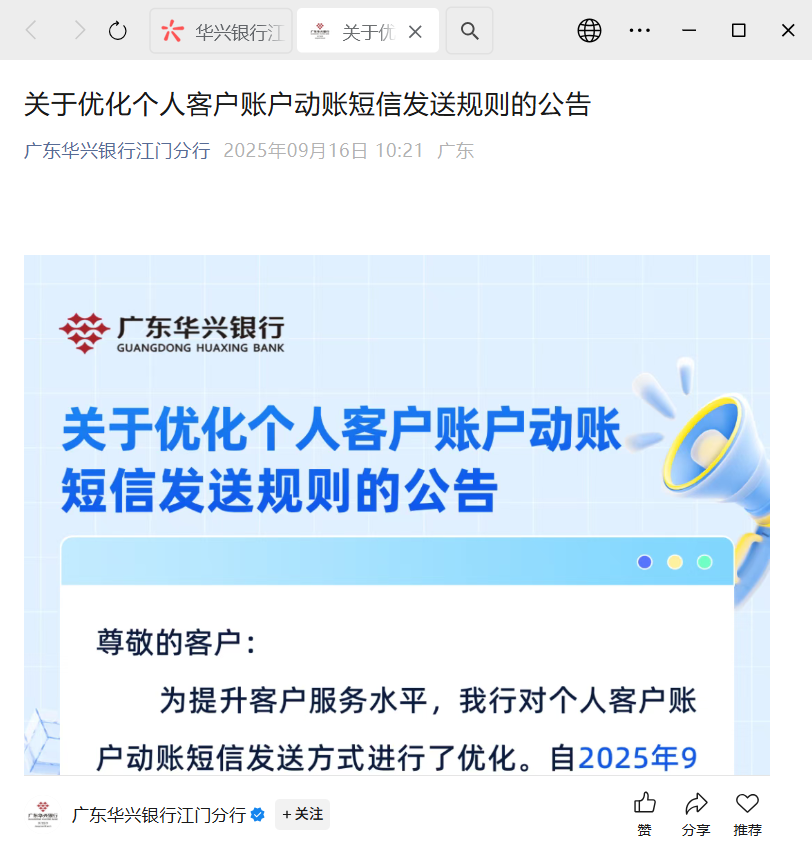 财联社记者注意到,尽管多家银行已经叫停了部分账户的免费手机短信通知服务,但客户依然可以通过其他渠道获得账户的即时信息。比如,华兴银行指出,客户可以通过“广东华兴银行微银行”公众号继续接收500元以下的动账提醒,还可以下载该行手机APP打开“设置”中该行APP的“通知权限”。