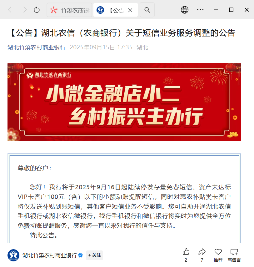 昨日晚间,湖北竹溪农商银行、鄂州农商银行也通过官方渠道发布了类似信息。比如,湖北竹溪农商银行在公告中指出,将于9月16日起,陆续停发存量免费短信、资产未达标VIP卡100元(含)以下的小额动账提醒短信,其他客户的短信业务不受影响。